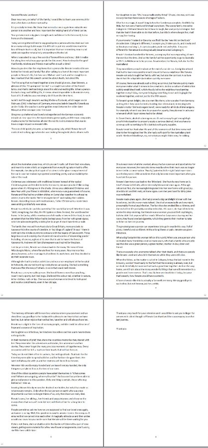 Wie beschreibt man die Leere, die ein Mensch wie Renate Leonhard bei Freunden und Familie hinterlässt? Nachdem ich aber mit ein paar der wichtigsten Menschen im Leben von Renate gesprochen hatte, ihren beiden Söhnen Michael und Frank sowie ihrer Schwiegertochter, wurde mir klar, dass es in dieser Ansprache nicht um den Tod gehen kann, sondern um das Leben.
